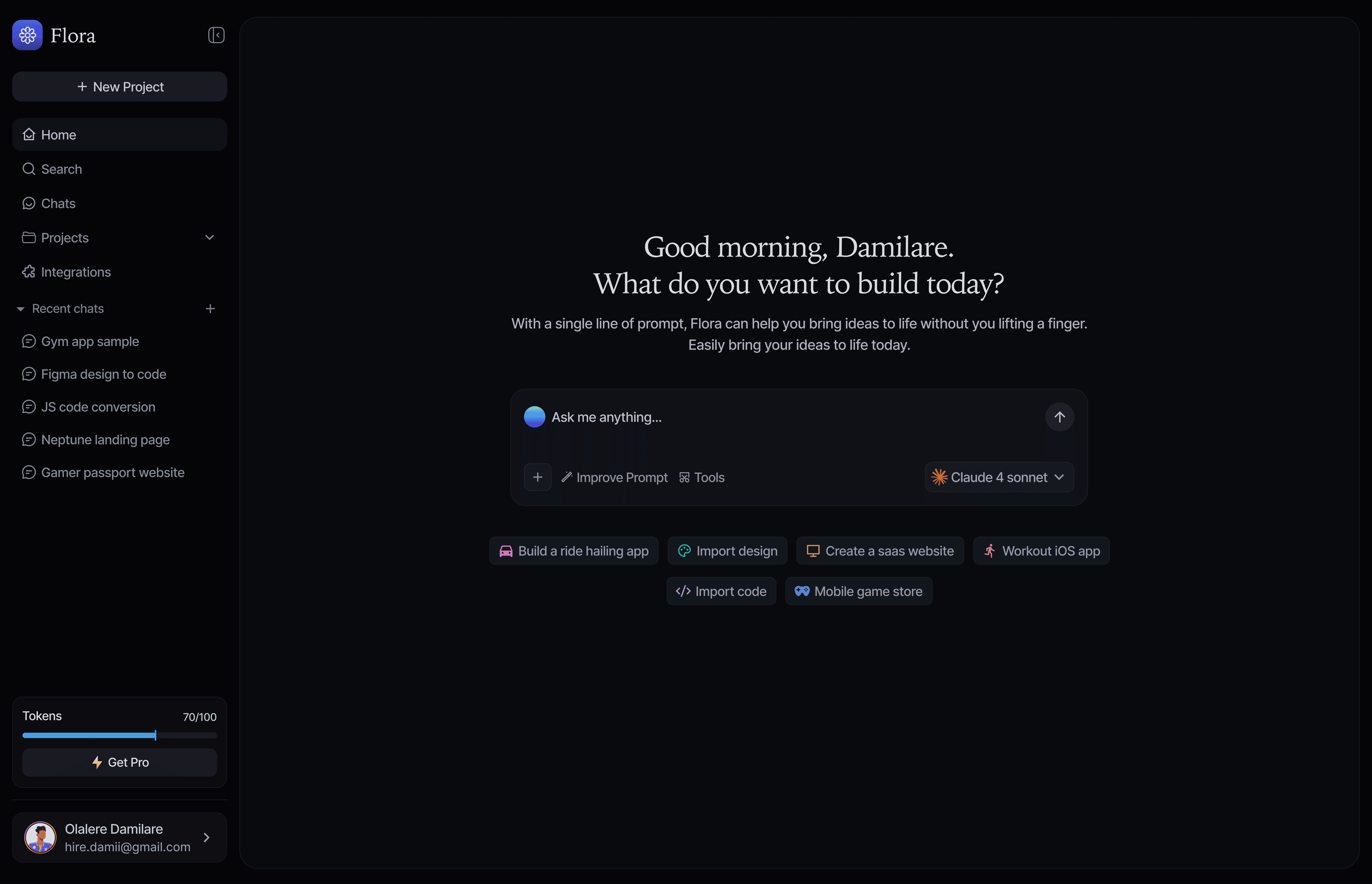 This screen is the main entry point into Flora. Users are encouraged to describe what they want to build in their own words. Suggested actions help new users understand what’s possible without feeling overwhelmed.