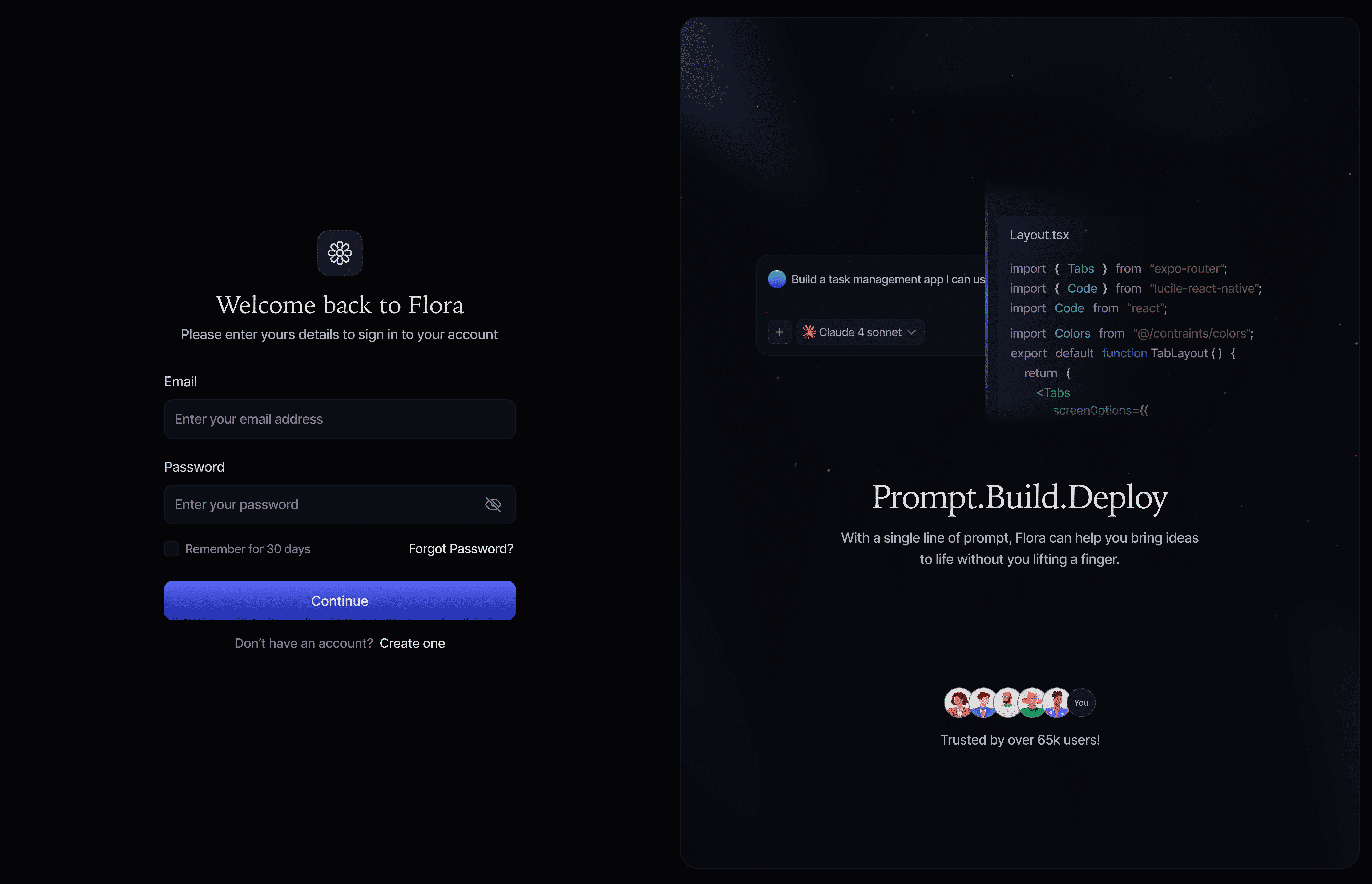 The sign-in experience is clean and welcoming, designed to get users into the product quickly. The supporting visual introduces Flora’s core value - Prompt. Build. Deploy - setting expectations before users begin.