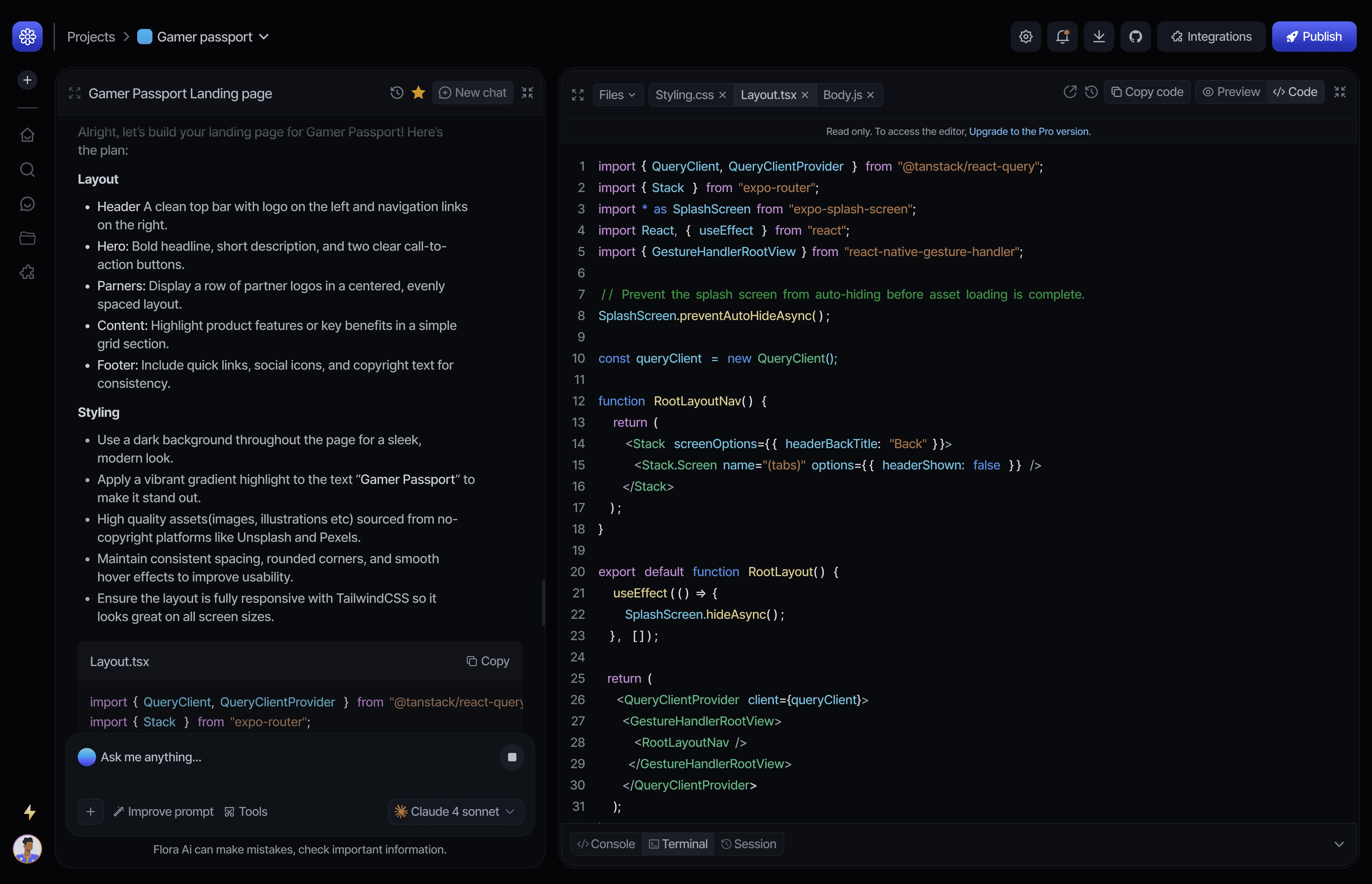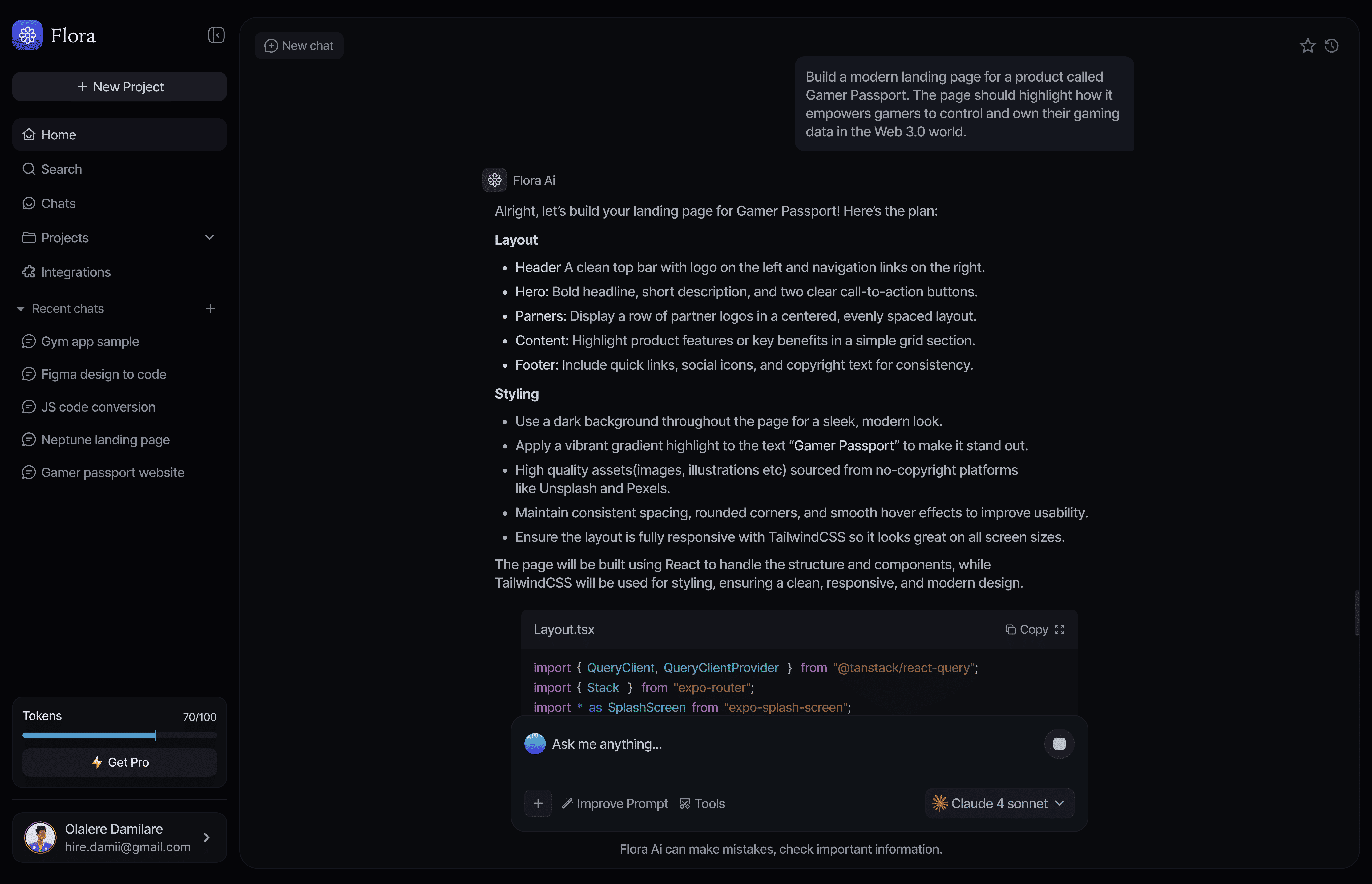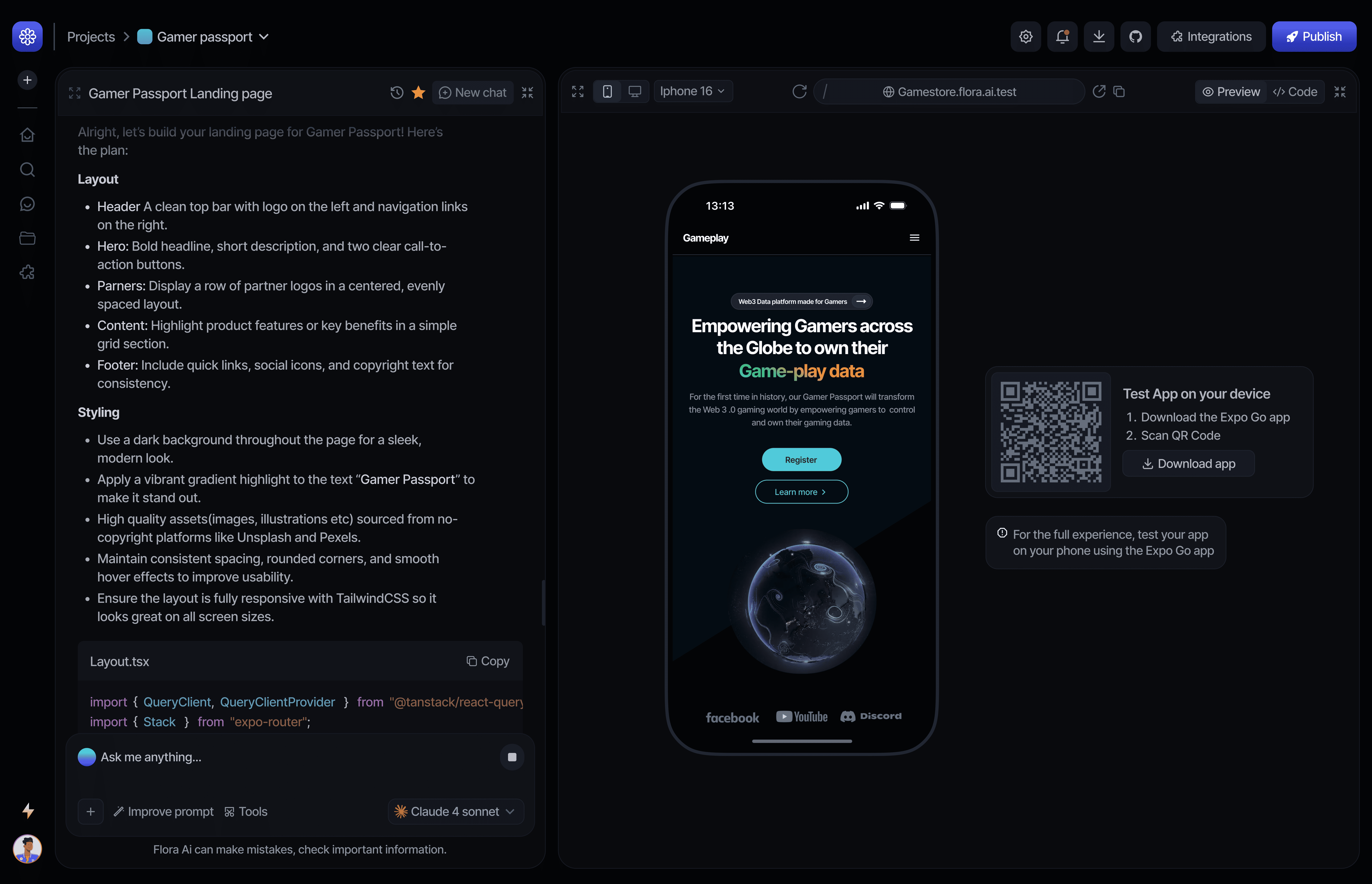 Flora is an AI-powered coding assistant that helps users build, iterate and deploy applications using natural language prompts. The platform combines prompt-based interactions, real-time code generation, live previews and project management in a single workspace. I designed the product interface to make AI-assisted development intuitive, fast and production-focused.