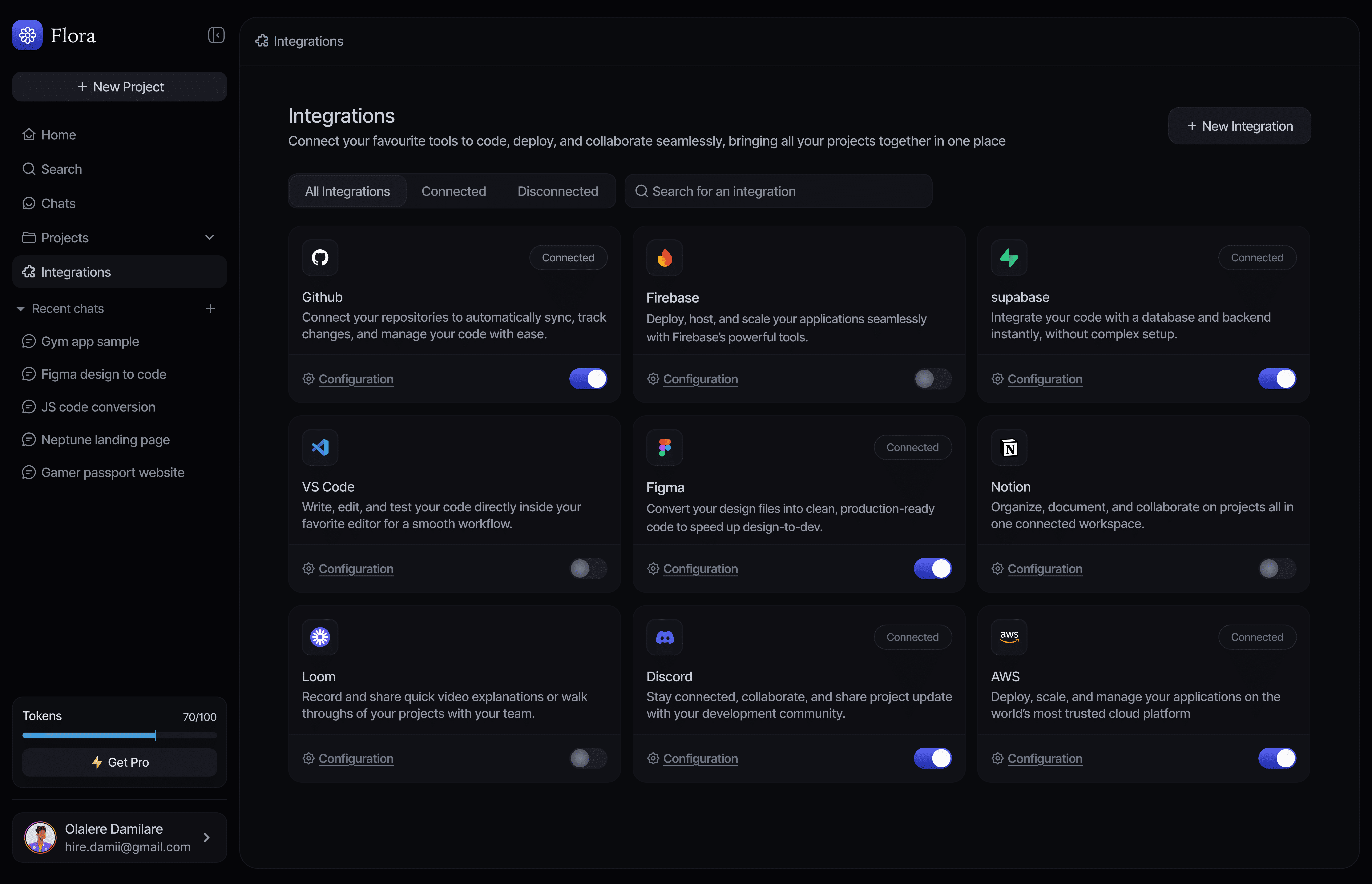 This section allows users to connect Flora with other tools they already use. The layout is designed to feel simple and scalable, with clear connection states and actions.